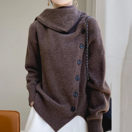 Autumn/Winter New Women's 100% Wool Cashmere Sweater Scarf Tie Button Pullover Loose Korean Fashion Knitted Women's Top