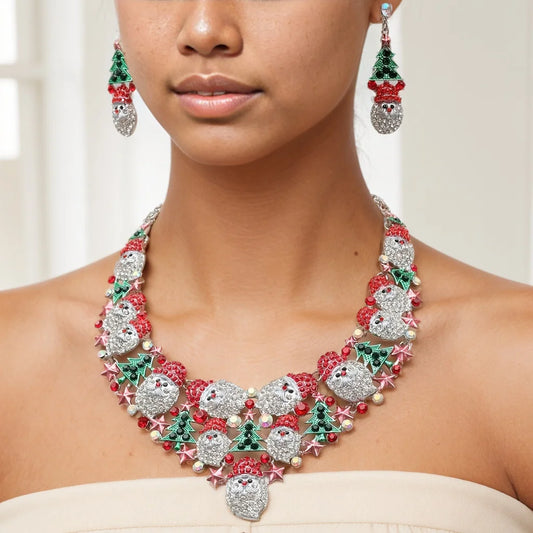 3pcs Elegant Rhinestone Beaded Christmas Necklace Earrings Set,Cute Rice Bead Enamel Santa Clau Party Women Accessorie