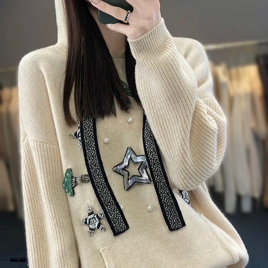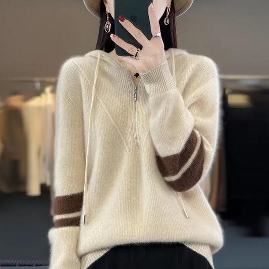 Autumn and Winter New Women's Cashmere Sweater 100% Wool Hoodie Knitted Pullover Loose Korean Fashion Thickened Top