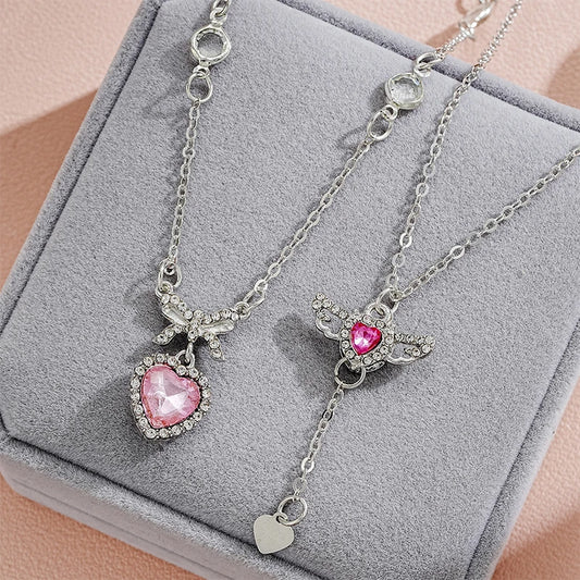 2PCS Crystal Angel Wings Heart Pendant Necklaces Set Ladies Girl Simple Y2K Pink White Zircon Love Elegant Necklace For Women