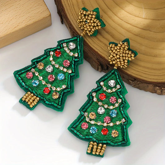 Boho Handmade Beaded Rhinestone Christmas Tree Earrings