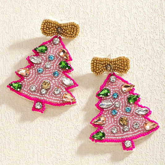 Boho Handmade Beaded Rhinestone Christmas Tree Earrings,Christmas Cute Rice Beaded Bow Festival Party Women Accessories