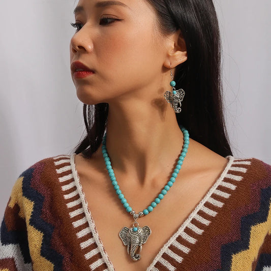 Bohemian Turquoise Elephant Necklace Earrings Set for Women Girls Party Holiday Jewelry Accessories