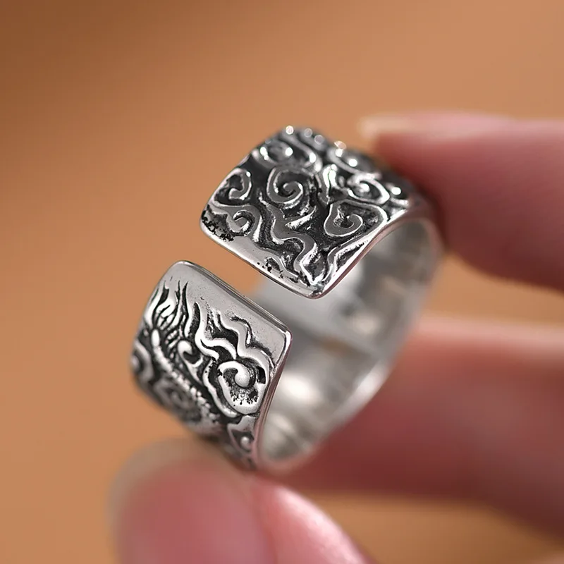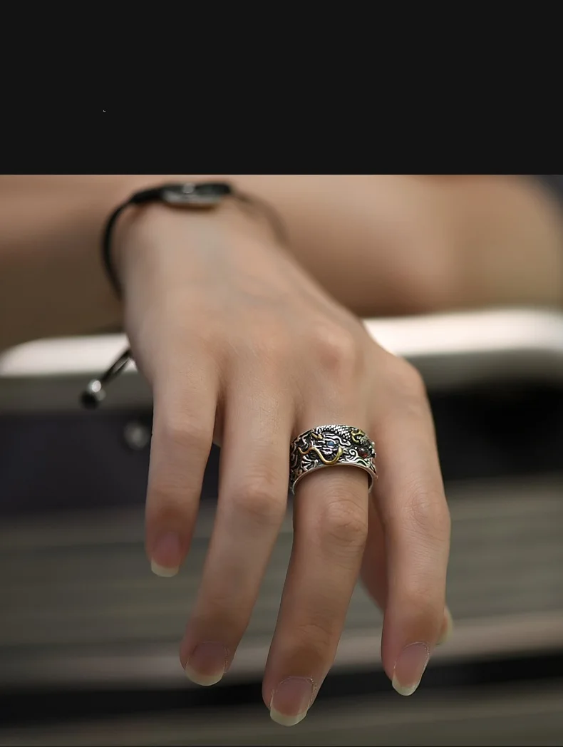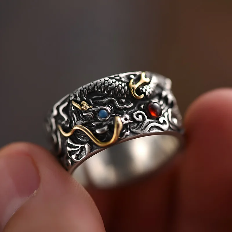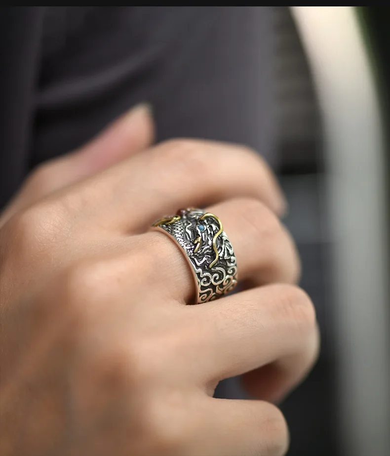 Classic Vintage Style Dragon Silver Ring Turquoise Onyx Open Adjustable Rings
