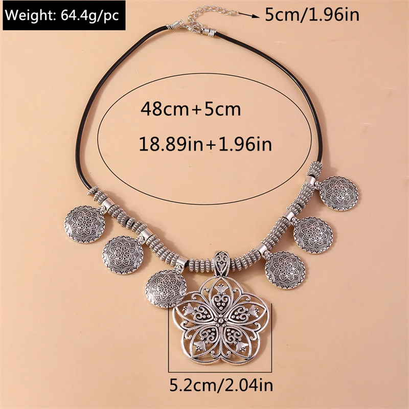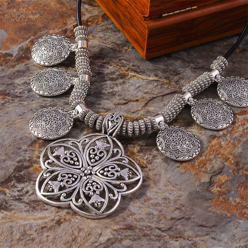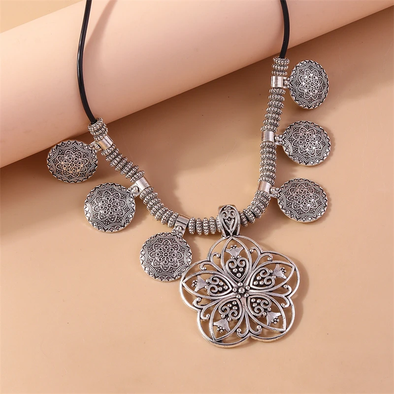 Ethnic Tibetan Silver Alloy Flower Pendant Necklace for Women Girls Party Holiday Jewelry Accessories