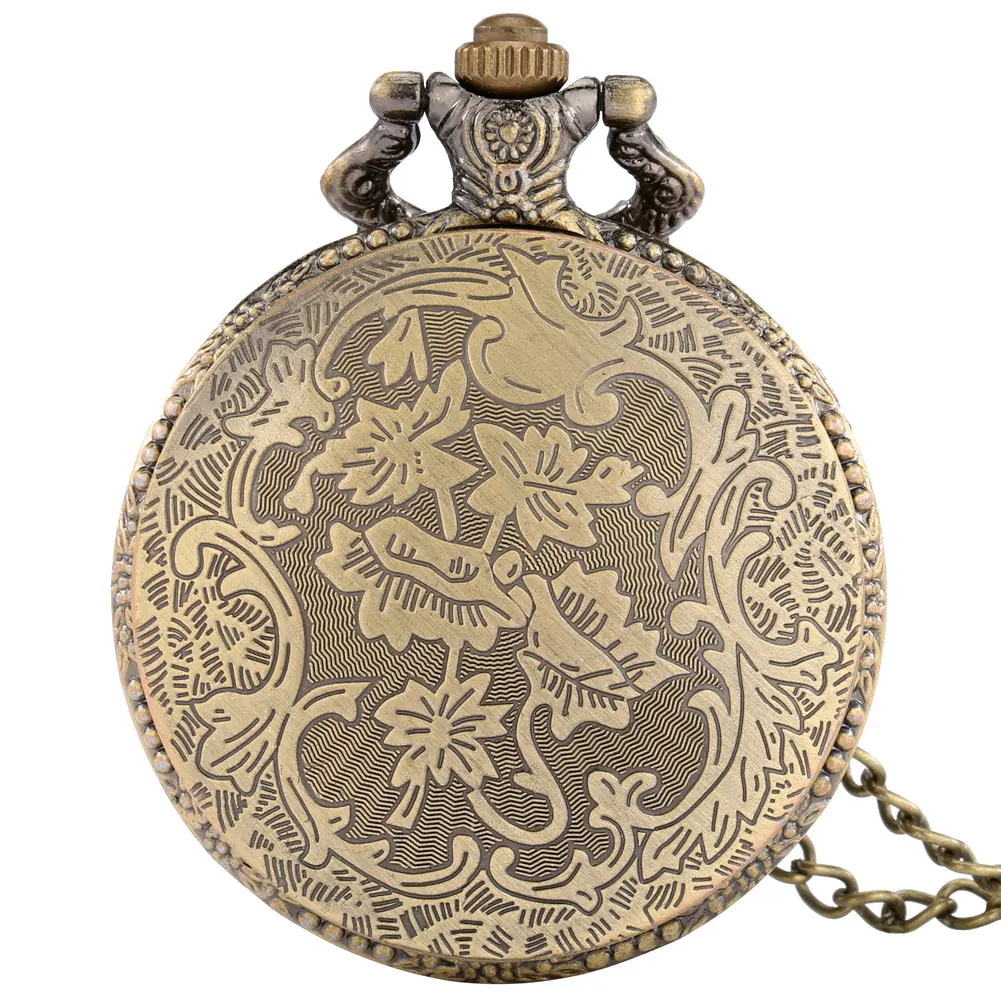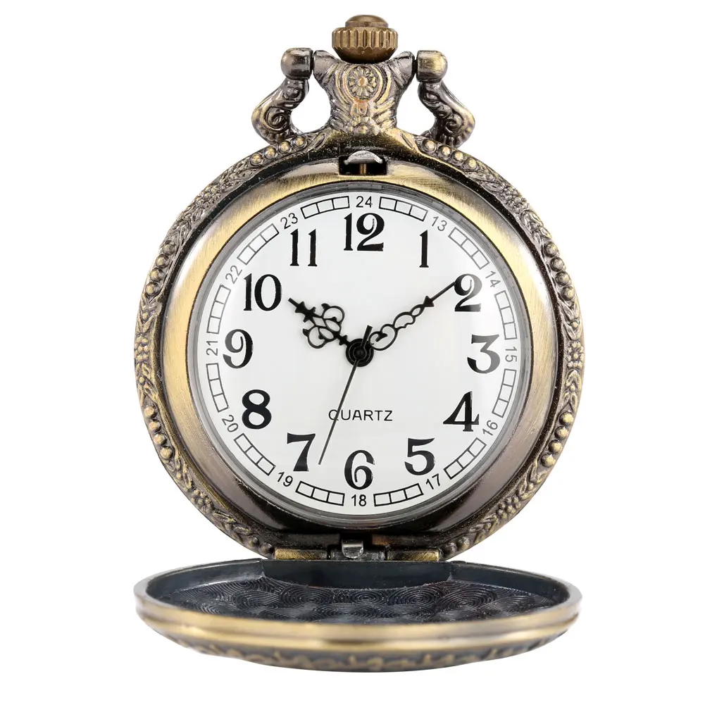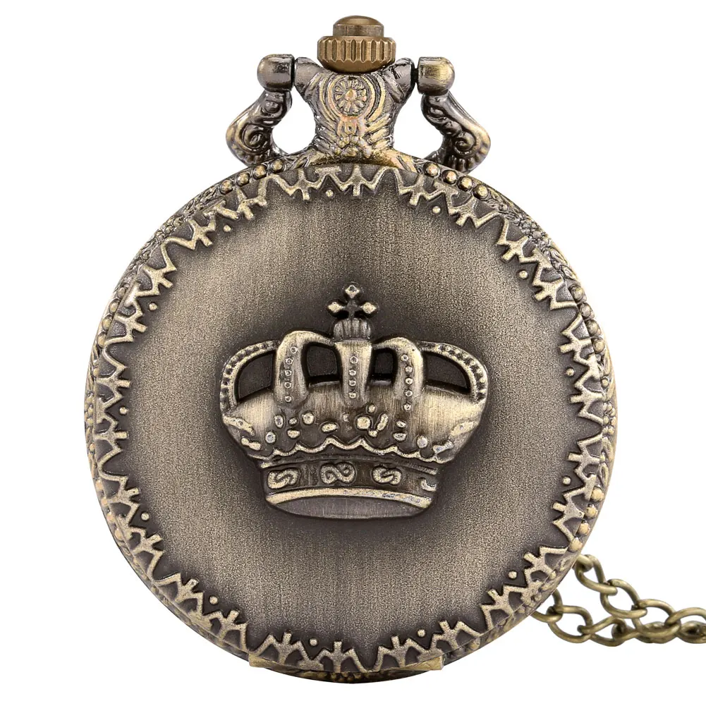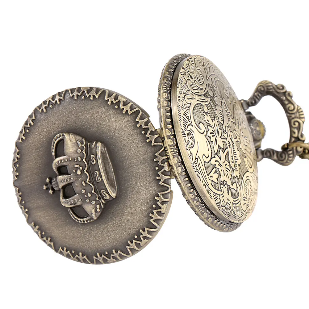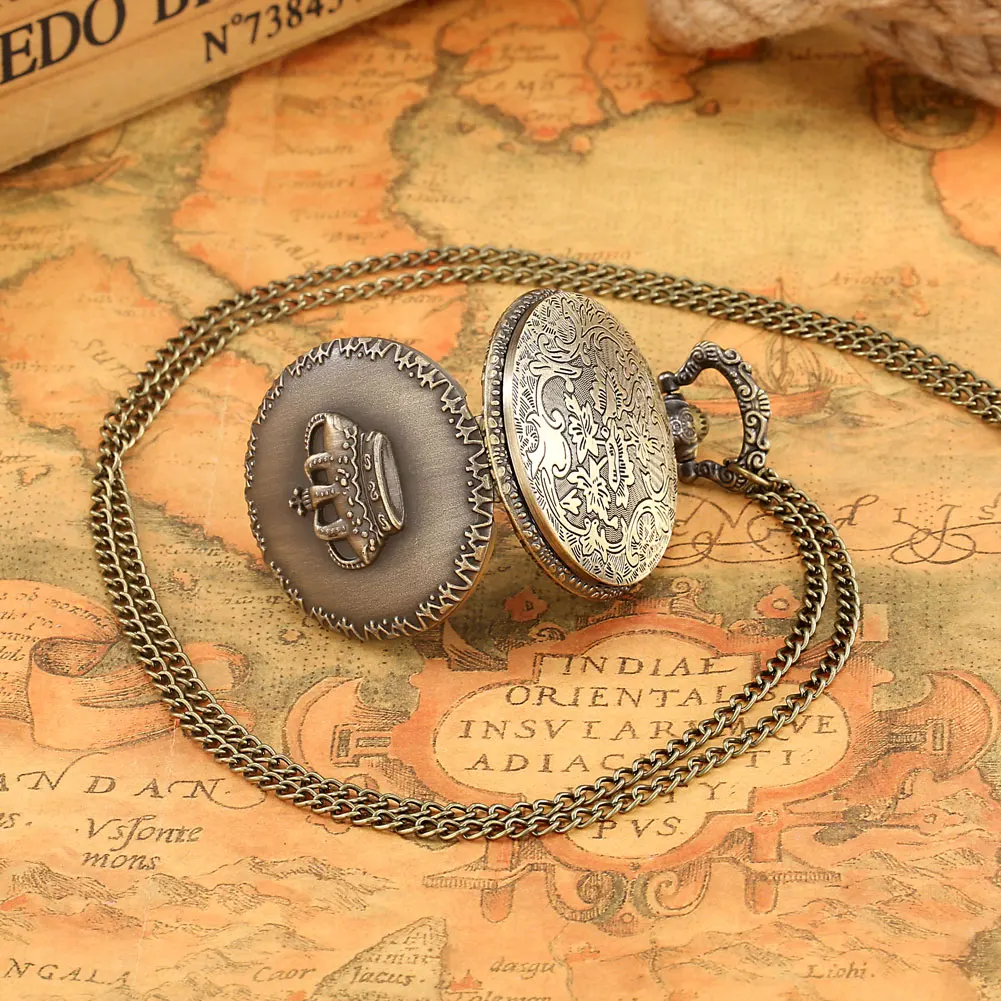 Retro Embossed Crown Design Quartz Pocket Watch Bronze Clamshell Pendant Sweater Chain Necklace Gifts for Men Women