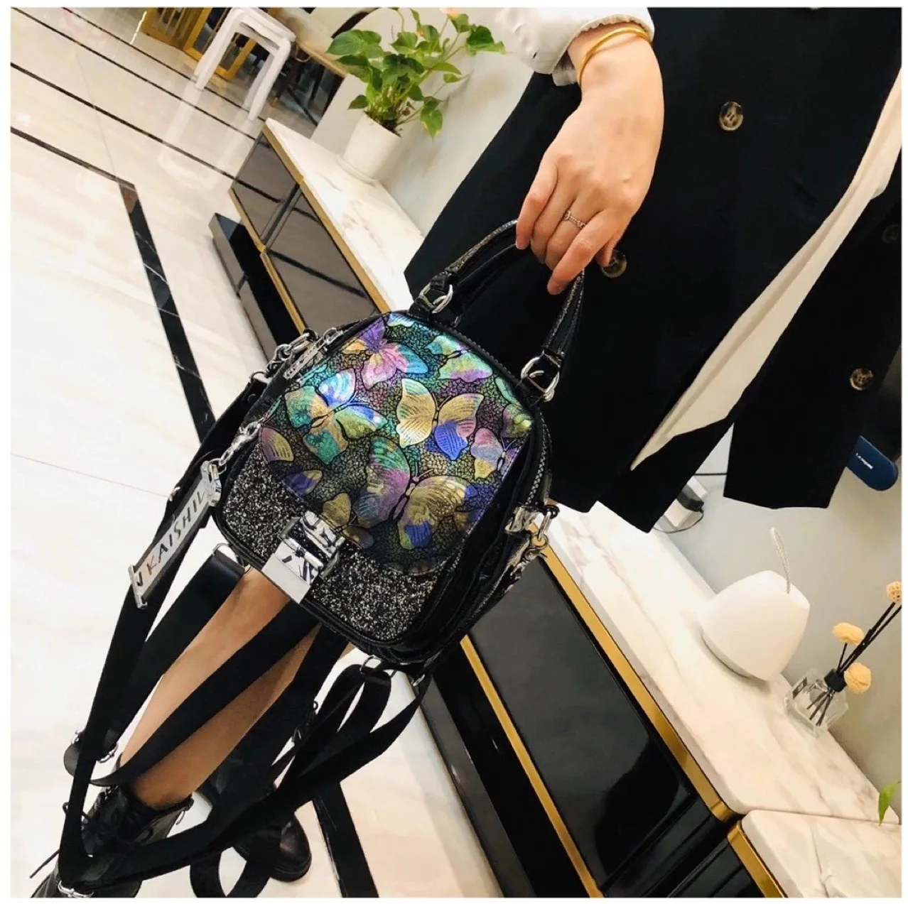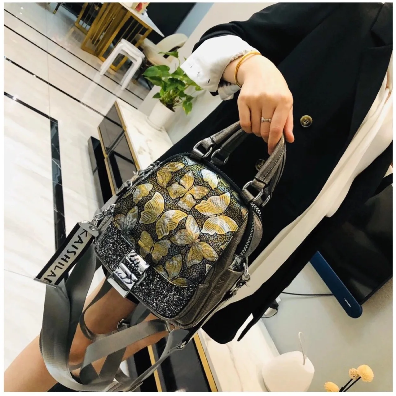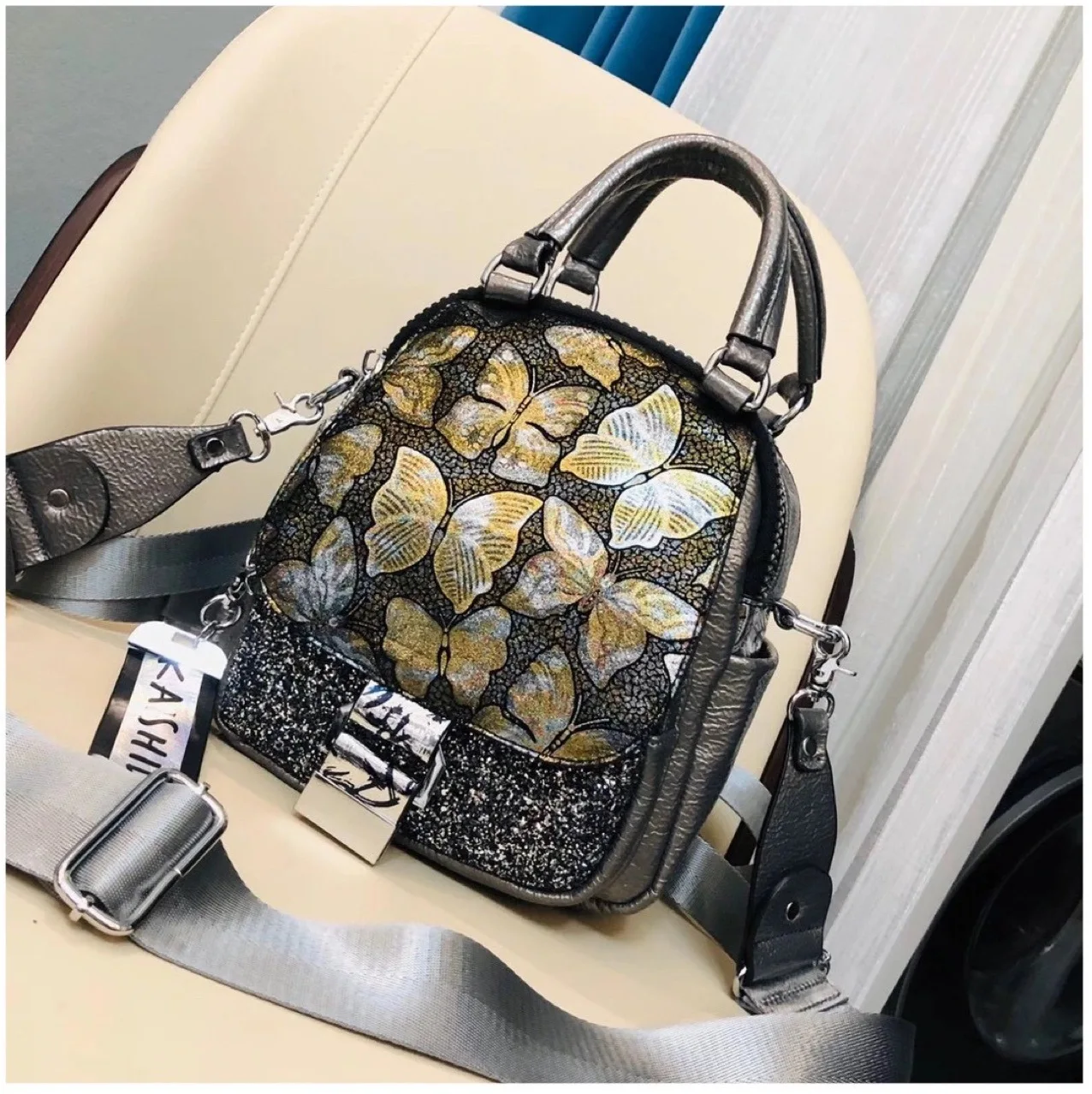 Women Vegan Leather Butterfly Small Size Backpack Female PU Leather Rhinestone Multi-pockets Travel Convertible Handbag Daypack